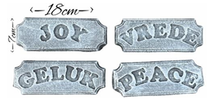 A charming set of compact inspirational panels featuring four uplifting words: JOY, VREDE, GELUK, and PEACE. Each piece carries a softly embossed design with a classic border, making them perfect for creating a small feature wall or adding meaningful accents throughout the home.